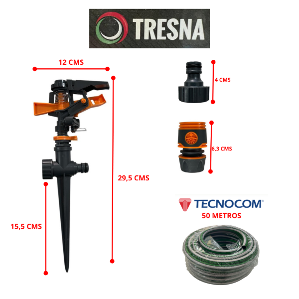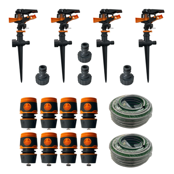 KIT COMBO RIEGO 4 ASPERSORES + CONECTORES + ACOPLES + 50 MTS MANGUERA REFORZADA.