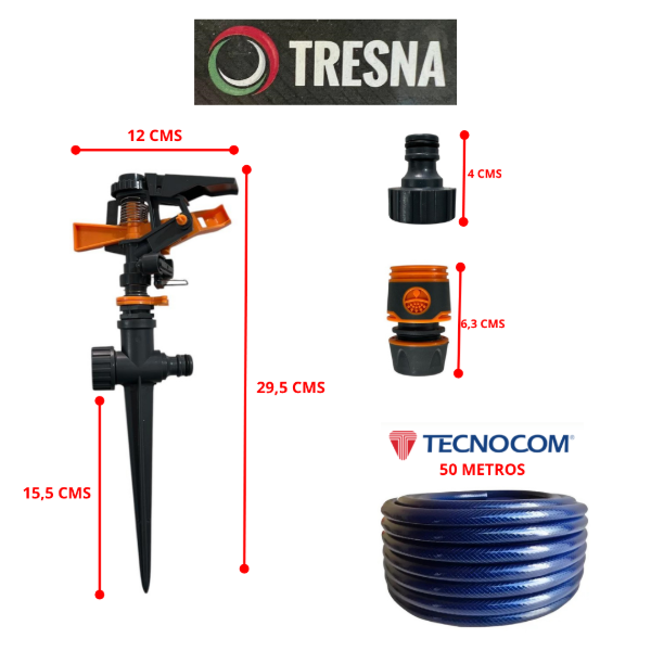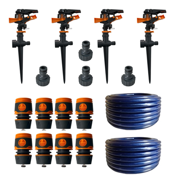KIT COMBO RIEGO 4 ASPERSORES + CONECTORES + ACOPLES + 50 MTS MANGUERA TRENZADA.